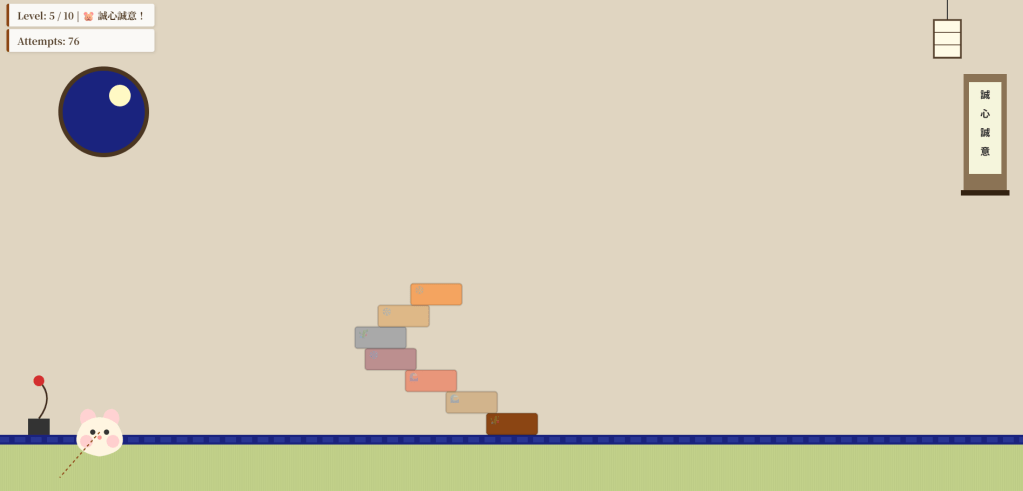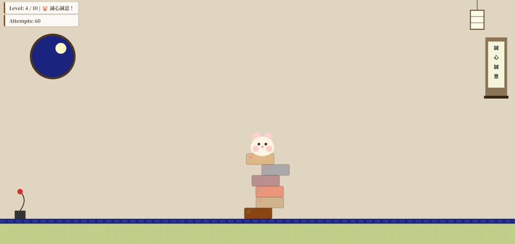 <!DOCTYPE html><html lang="ja"><head> <meta charset="UTF-8"> <title>Hamster Tower Stack - Miyabi</title> <style> body { margin: 0; overflow: hidden; background: #e0d5c1; font-family: 'Hiragino Mincho ProN', serif; } canvas { display: block; margin: 0 auto; touch-action: none; } #ui { position: absolute; top: 20px; left: 20px; pointer-events: none; display: flex; flex-direction: column; gap: 5px; } .msg { font-size: 18px; font-weight: bold; color: #4b3621; background: rgba(255,255,255,0.85); padding: 8px 15px; border-radius: 4px; border-left: 5px solid #8b4513; box-shadow: 2px 2px 5px rgba(0,0,0,0.1); } </style></head><body> <div id="ui"> <div class="msg" id="status">Level: 1 / 10</div> <div class="msg" id="attempts">Attempts: 0</div> </div> <canvas id="gameCanvas"></canvas> <script> const canvas = document.getElementById('gameCanvas'); const ctx = canvas.getContext('2d'); const statusEl = document.getElementById('status'); const attemptsEl = document.getElementById('attempts'); let stage = 1; let attempts = 0; let currentLevel = 1; let targetLevels = 5; const baseWidth = 130; const blockHeight = 40; const groundY = 130; let blocks = []; let activeBlock = null; let isDragging = false; let dragStart = { x: 0, y: 0 }; let dragCurrent = { x: 0, y: 0 }; const colors = ["#8B4513", "#D2B48C", "#E9967A", "#BC8F8F", "#A9A9A9", "#DEB887", "#F4A460", "#CD853F", "#D2691E", "#FFD2D2"]; const patterns = ["🌸", "🌊", "🎋", "❄️"]; function init() { canvas.width = window.innerWidth; canvas.height = window.innerHeight; resetStage(); } function resetStage() { if (stage > 10) { alert("究極の誠心誠意!全レベル制覇です!🐹🍵"); stage = 1; attempts = 0; } targetLevels = 5 + Math.floor((stage - 1) / 2); const width = Math.max(30, baseWidth - (stage * 7)); blocks = [{ x: canvas.width / 2 - width / 2, y: canvas.height - groundY - blockHeight, w: width, h: blockHeight, color: colors[0], pattern: "🎋", settled: true }]; currentLevel = 1; spawnBlock(); } function spawnBlock() { const width = Math.max(30, baseWidth - (stage * 7)); const isHam = (currentLevel === targetLevels); activeBlock = { x: 150, y: canvas.height - groundY - 40, w: isHam ? 85 : width, h: isHam ? 70 : blockHeight, type: isHam ? 'hamster' : 'body', color: colors[currentLevel % colors.length], pattern: patterns[Math.floor(Math.random() * patterns.length)], vx: 0, vy: 0, isFlying: false }; statusEl.innerText = `Level: ${stage} / 10 | ${isHam ? '🐹 誠心誠意!' : 'Block: ' + currentLevel + ' / ' + targetLevels}`; attemptsEl.innerText = `Attempts: ${attempts}`; } function drawTeaRoom() { // 壁 ctx.fillStyle = "#e0d5c1"; ctx.fillRect(0, 0, canvas.width, canvas.height); // 丸窓 (左側) ctx.save(); ctx.beginPath(); ctx.arc(200, 220, 80, 0, Math.PI * 2); ctx.clip(); ctx.fillStyle = "#1a237e"; // 夜空 ctx.fillRect(120, 140, 160, 160); ctx.fillStyle = "#fff9c4"; // 月 ctx.beginPath(); ctx.arc(230, 190, 20, 0, Math.PI*2); ctx.fill(); ctx.restore(); ctx.strokeStyle = "#4b3621"; ctx.lineWidth = 8; ctx.beginPath(); ctx.arc(200, 220, 80, 0, Math.PI * 2); ctx.stroke(); // 吊り行灯 (右上) const lx = canvas.width - 150, ly = 0; ctx.strokeStyle = "#333"; ctx.lineWidth = 2; ctx.beginPath(); ctx.moveTo(lx, 0); ctx.lineTo(lx, 50); ctx.stroke(); ctx.fillStyle = "#fffbe6"; ctx.fillRect(lx-25, 50, 50, 70); ctx.strokeStyle = "#4b3621"; ctx.lineWidth = 3; ctx.strokeRect(lx-25, 50, 50, 70); ctx.lineWidth = 1; for(let i=0; i<3; i++) { ctx.strokeRect(lx-25, 50 + i*23, 50, 23); } // 掛け軸 (右側・UIに被らない位置) const kx = canvas.width - 120, ky = 150, kw = 80, kh = 220; ctx.fillStyle = "#8b7355"; ctx.fillRect(kx, ky, kw, kh); ctx.fillStyle = "#f5f5dc"; ctx.fillRect(kx + 10, ky + 15, kw - 20, kh - 50); ctx.fillStyle = "#332211"; ctx.fillRect(kx - 5, ky + kh - 5, kw + 10, 10); ctx.fillStyle = "#222"; ctx.font = "bold 18px 'Hiragino Mincho ProN'"; ["誠","心","誠","意"].forEach((t, i) => ctx.fillText(t, kx+31, ky+45 + i*35)); // 畳 const groundTop = canvas.height - groundY; ctx.fillStyle = "#c2d18a"; ctx.fillRect(0, groundTop, canvas.width, groundY); // 畳の質感(線) ctx.strokeStyle = "rgba(0,0,0,0.05)"; ctx.lineWidth = 1; for(let i=0; i<canvas.width; i+=4) { ctx.beginPath(); ctx.moveTo(i, groundTop); ctx.lineTo(i, canvas.height); ctx.stroke(); } // 畳の縁(ヘリ) ctx.fillStyle = "#1a237e"; ctx.fillRect(0, groundTop, canvas.width, 18); ctx.fillStyle = "#283593"; // 縁の紋様っぽく for(let i=0; i<canvas.width; i+=30) { ctx.fillRect(i+5, groundTop+4, 20, 10); } // 生け花 const fx = 80, fy = groundTop; ctx.fillStyle = "#333"; ctx.fillRect(fx-20, fy-30, 40, 30); ctx.strokeStyle = "#3e2723"; ctx.lineWidth = 3; ctx.beginPath(); ctx.moveTo(fx, fy-30); ctx.quadraticCurveTo(fx+30, fy-70, fx, fy-100); ctx.stroke(); ctx.fillStyle = "#d32f2f"; ctx.beginPath(); ctx.arc(fx, fy-100, 10, 0, Math.PI*2); ctx.fill(); } function drawHamster(b) { const x = b.x, y = b.y, w = b.w, h = b.h; ctx.fillStyle = "#FFD2D2"; ctx.beginPath(); ctx.ellipse(x + w*0.25, y + 10, 15, 18, -0.1, 0, Math.PI * 2); ctx.ellipse(x + w*0.75, y + 10, 15, 18, 0.1, 0, Math.PI * 2); ctx.fill(); ctx.fillStyle = "#FFF5E1"; ctx.beginPath(); ctx.moveTo(x + 10, y + 20); ctx.quadraticCurveTo(x - 22, y + h, x + w/2, y + h + 10); ctx.quadraticCurveTo(x + w + 22, y + h, x + w - 10, y + 20); ctx.quadraticCurveTo(x + w/2, y - 5, x + 10, y + 20); ctx.fill(); ctx.fillStyle = "rgba(255, 182, 193, 0.6)"; ctx.beginPath(); ctx.arc(x + 18, y + h - 18, 12, 0, Math.PI * 2); ctx.arc(x + w - 18, y + h - 18, 12, 0, Math.PI * 2); ctx.fill(); ctx.fillStyle = "#333"; ctx.beginPath(); ctx.arc(x + w*0.35, y + 35, 5, 0, Math.PI * 2); ctx.arc(x + w*0.65, y + 35, 5, 0, Math.PI * 2); ctx.fill(); ctx.fillStyle = "#FF9999"; ctx.beginPath(); ctx.arc(x + w/2, y + 45, 4, 0, Math.PI * 2); ctx.fill(); } function update() { if (activeBlock && activeBlock.isFlying) { activeBlock.vy += 0.25; activeBlock.x += activeBlock.vx; activeBlock.y += activeBlock.vy; const target = blocks[blocks.length 