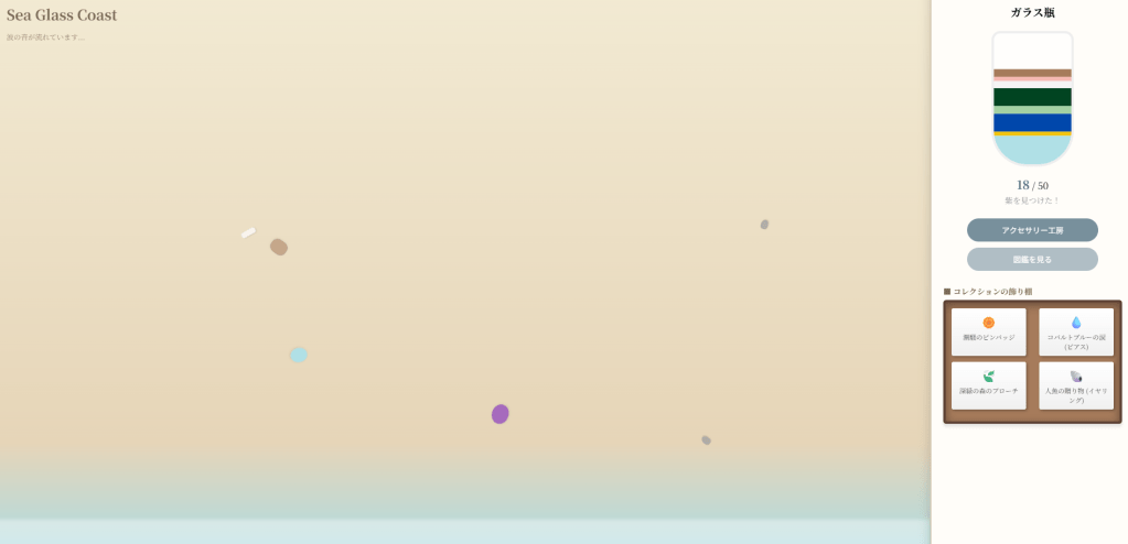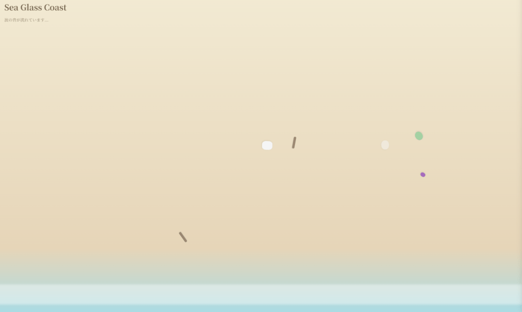 今回の記事では、AI と相談しながら作った「シーグラス探しゲーム」の HTML コードを公開します。ブラウザだけで動く、とてもシンプルなゲームです。