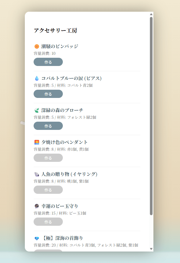 拾ったシーグラスでアクセサリーが作れて、画面右下の飾り棚へ作ったのを飾れます。